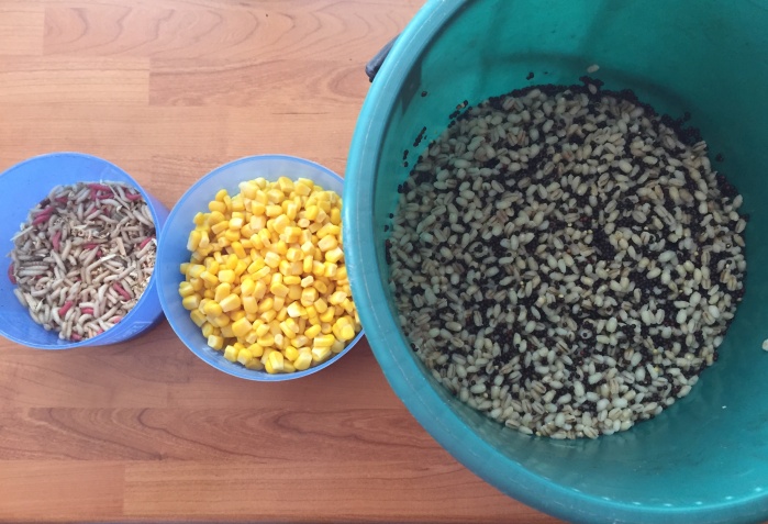 Cílovou rybou je kapr, takže volím hrubé krmení s příměsí rybích mouček. Rozdělávám si jen kilovku v suchém stavu a dostávám zhruba 2,5 – 3 litry vlhké směsi. Další velmi důležitou součástí jsou další 2 litry mixu kukuřice, uvařených krup a řepky, která byla spařena v horké vodě. Vnadění tedy připraveno.