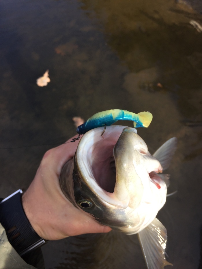 Za rozednění pomalu scházím k odkrytému starému jezu a elektrárně. Pohled na vodní dílo je vážně impozantní, při plném stavu vody zde ryby musely nacházet doslova ideální úkryty. Nelením a pouštím se do prochytávání úseku pod jezem. Zvolil jsem gumové nástrahy, především menší kopyta, nymfy a v klidnější vodě přijde řada i na smáčka.
