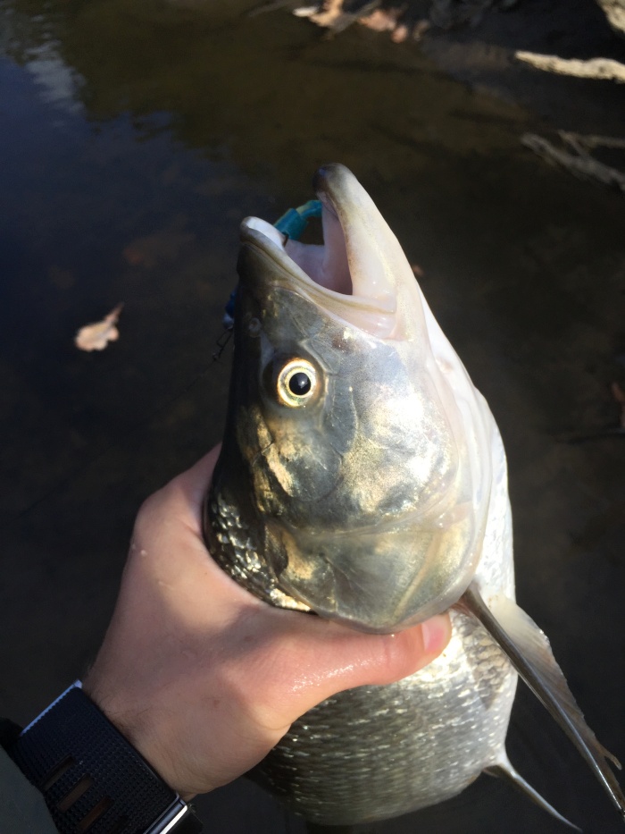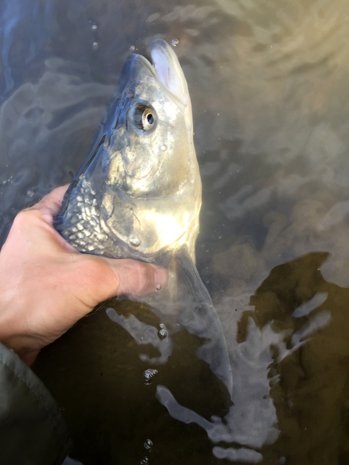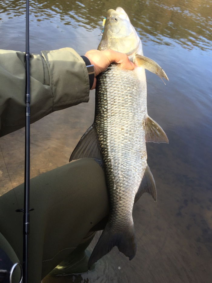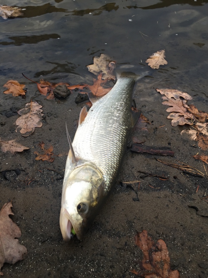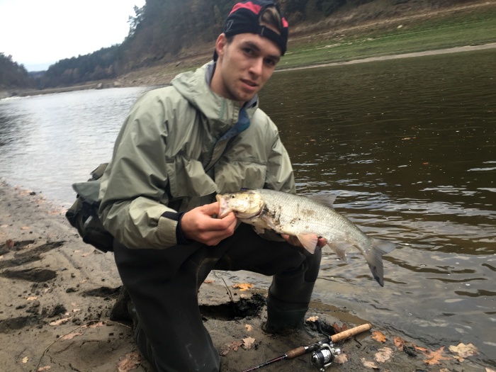 Ve chvíli kdy popojdeme o něco níž, začíná vylézat sluníčko a aktivita ryb se o něco zvýší. Sotva na hladinu dopadly sluneční paprsky, vidím, jak se Jarda pere v proudu s lepší rybou. A skutečně. Za chvíli ke břehu přivádí menšího bolena. Rychlá fotka a jde zpět do vody.