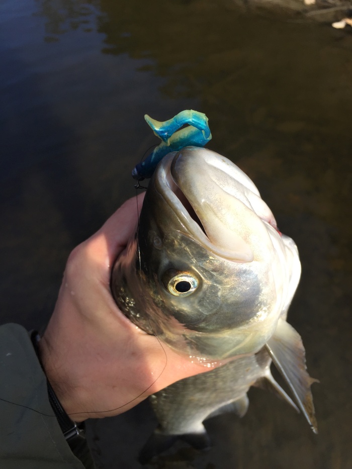 Já za chvíli kontruji menším candátkem na oblíbeného smáčka. Následně se rozhoduji proházet tažnější vodu výraznějším kopytem. Dva hody – nic. Při třetím urazí nástraha ve vodě sotva 2 metry a do prutu dostávám ránu, že mi ho ryba skoro vyrazí z ruky. Z počátku souboje nemám příliš šancí. UL proutek se ohýbá až k navijáku a ryba si bere po proudu metry vlasce. Nedá se nic dělat, musím kousek níž za ní. Po chvíli přetahování ji dostávám ke břehu do klidnější vody, kde ji následně zdolávám. Výsledek? Krásné stříbrné torpédo – bolen 63 cm. Udělám pár fotek a vracím krasavce zpět do vody – dvakrát máchne ocasem a je pryč. Stejnou taktiku zkoušíme s Jardou dál, ale žádný větší kousek se už neobjevil.
