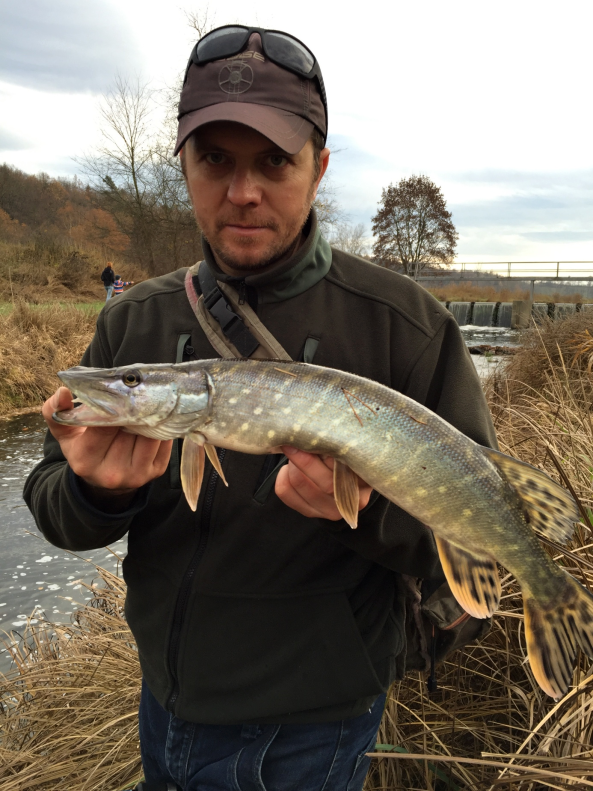 V tomto duchu se postupně přehoupne poledne a ryby přestávají reagovat. Musíme tedy evidentně pozměnit taktiku. Kromě změny nástrah nasazujeme i jinou montáž a měníme háčky za menší. Hned na první nahození přichází krásný záběr od okouna – i tentokrát mi ale padá. Dneska nějak není můj ideální den. Nedá se nic dělat, snažím se dál. Hned vzápětí dostává Jiří na svůj prut nádhernou štiku. Byl to krásný souboj, Jirka musel být opatrný, aby štiku neurazil nebo aby mu nezajela do nějaké překážky. Štiku ale celkem suverénně zdolal – jeho letité zkušenosti se ukázali. Někdy je skvělý zážitek i jen sledovat takovýto souboj. Štika měřila 55 cm a na 12 mm vlasec to byl vážně pěkný úlovek. Další fotka a pouštíme štiku zpátky řece.
