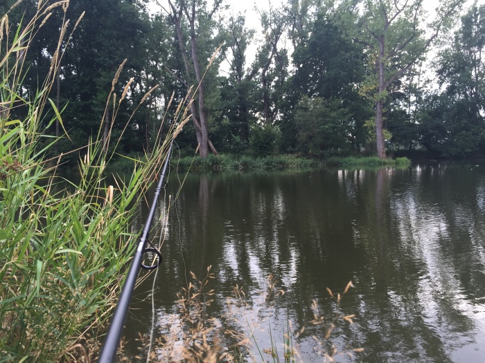 Když přicházím k vodě, minu pouze pár rybářů v přední hlubší části revíru a zaraduji se, že zadní mělká část částečně pokrytá vodními rostlinami je úplně volná a mohu ji tak celou prochytat. Brodím kolem břehu, kde mám zhruba po pás vody a prohazuji příběžní partie. Zatím se tu ukazují především kapři, kteří se prozrazují svými skoky (jeden jen asi 2 m za mými zády mě pěkně vyděsil). Prvních asi 15 hodů nepřichází ani záběr a tak se posouvám k místu, kde z vody vyčuhují dřevěné konstrukce a na nich budky pro vodní ptáky.